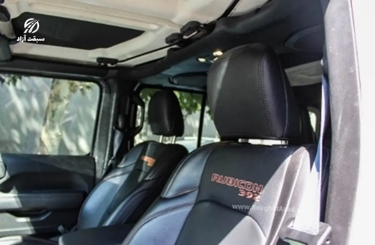 درون کابین، صندلیها با چرم Nappa مشکی و دوخت قرمز تزئین شدهاند. عبارت Rubicon 392 روی پشتی صندلیها حک شده است. صندلیهای جلو برقی و گرمکندار هستند و فرمان نیز گرمکن دارد.